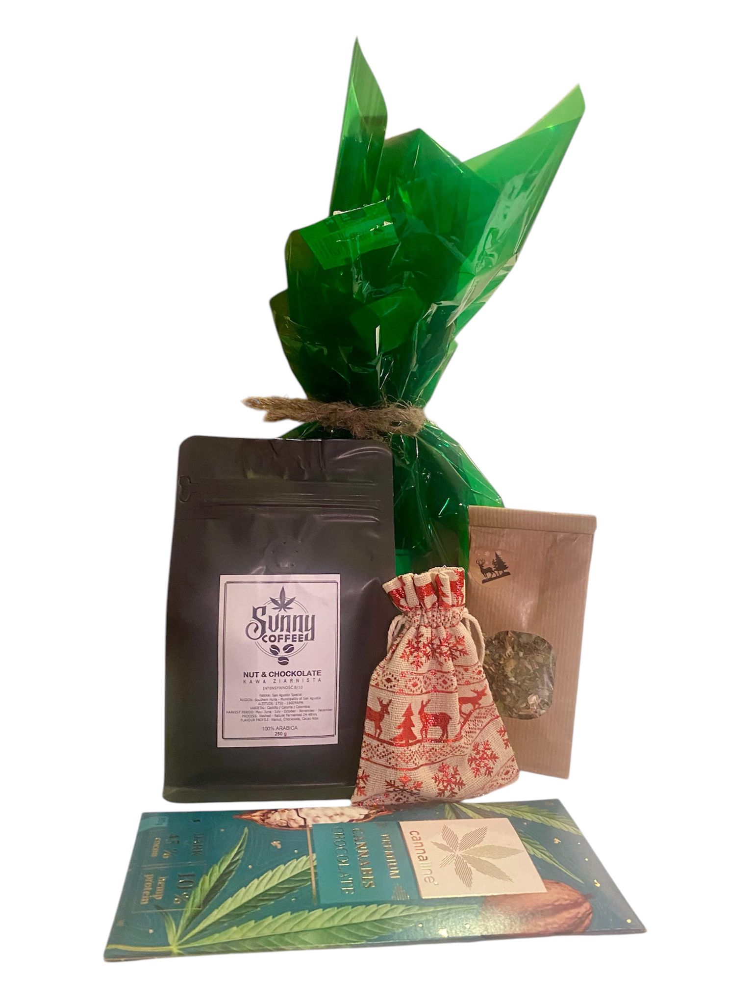 - Całość zamknięta w ozdobnym zielonym celofanie i przewiązana ekologicznym sznurkiem